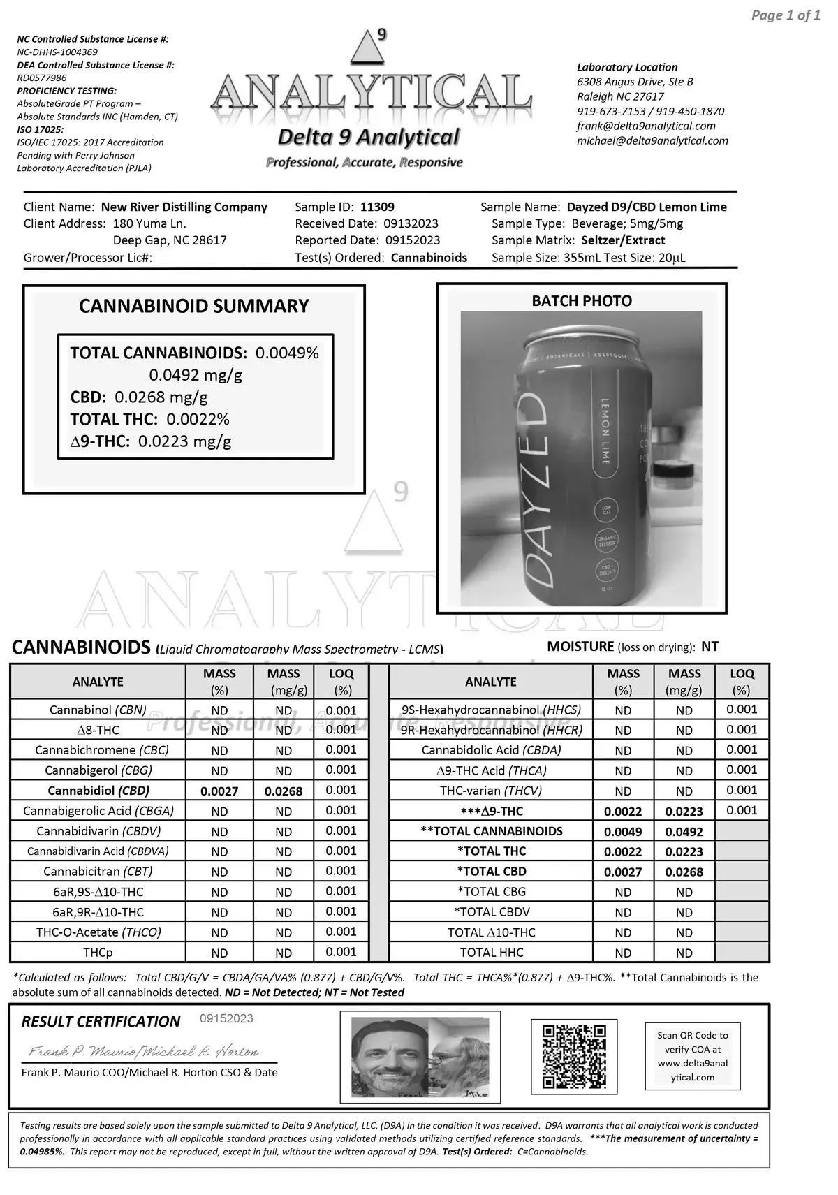 Ingredients: Mountain Water, Organic Lemon and lime extract, Organic Agave, D9 botanical extract, Ashwagandha, organic citric acid, Vitamins C, D, & B12.